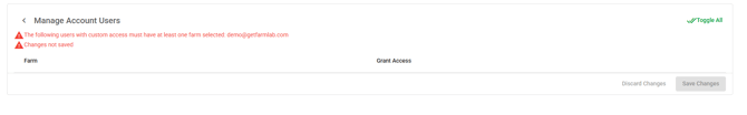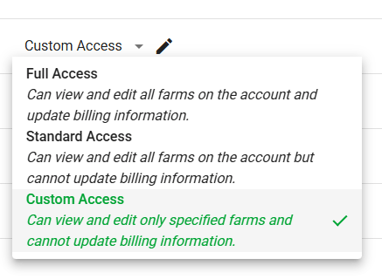 - Custom Access - This is best for users who do not need access to all projects but still need to be able to edit information on them. On selecting this option, you will be taken to the farm selection menu.
