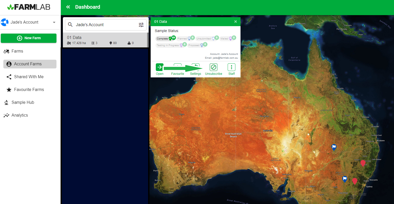 You can subscribe or unsubscribe from a farm in FarmLab by clicking on the farm details in the Dashboard section