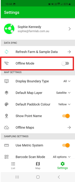 Offline mode when selected will prevent any syncing of data to happen until the user chooses to do a data sync. All data including photos, barcodes and point information will be stored on the device until the user chooses to conduct a data sync.