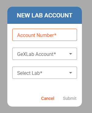 Select '+ New Account', add your account number and select the lab your account belongs to. If you are unaware of your lab account number, contact the lab directly.