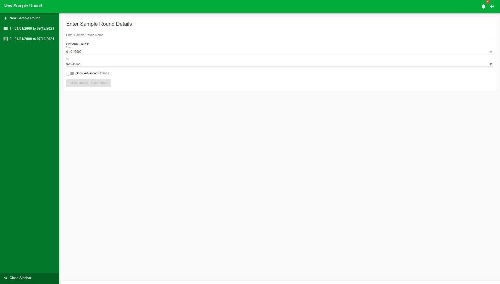 - Enter your round details. If you have any existing sample rounds, they will appear on the left-hand menu.