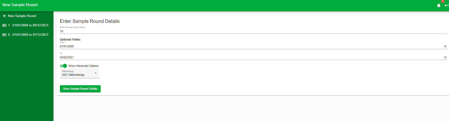 - Enter the sample round name (e.g. T0) and select the sampling date range. If you have samples collected outside of this date range, they won't be included in the calculations. You can also select the 2018 or 2021 calculations, but by default, FarmLab will use the 2021 calculations.