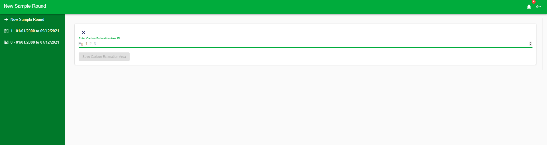 - Save the sample round details to be taken to the Carbon Estimation Area (CEA) input screen.