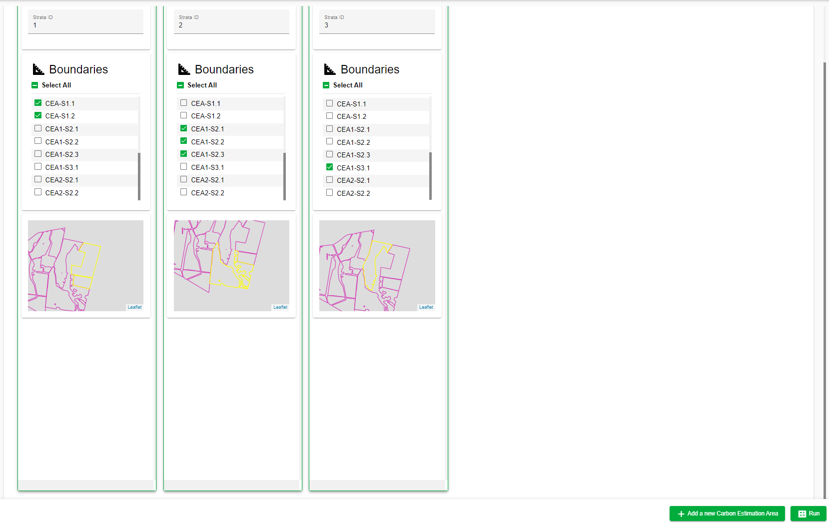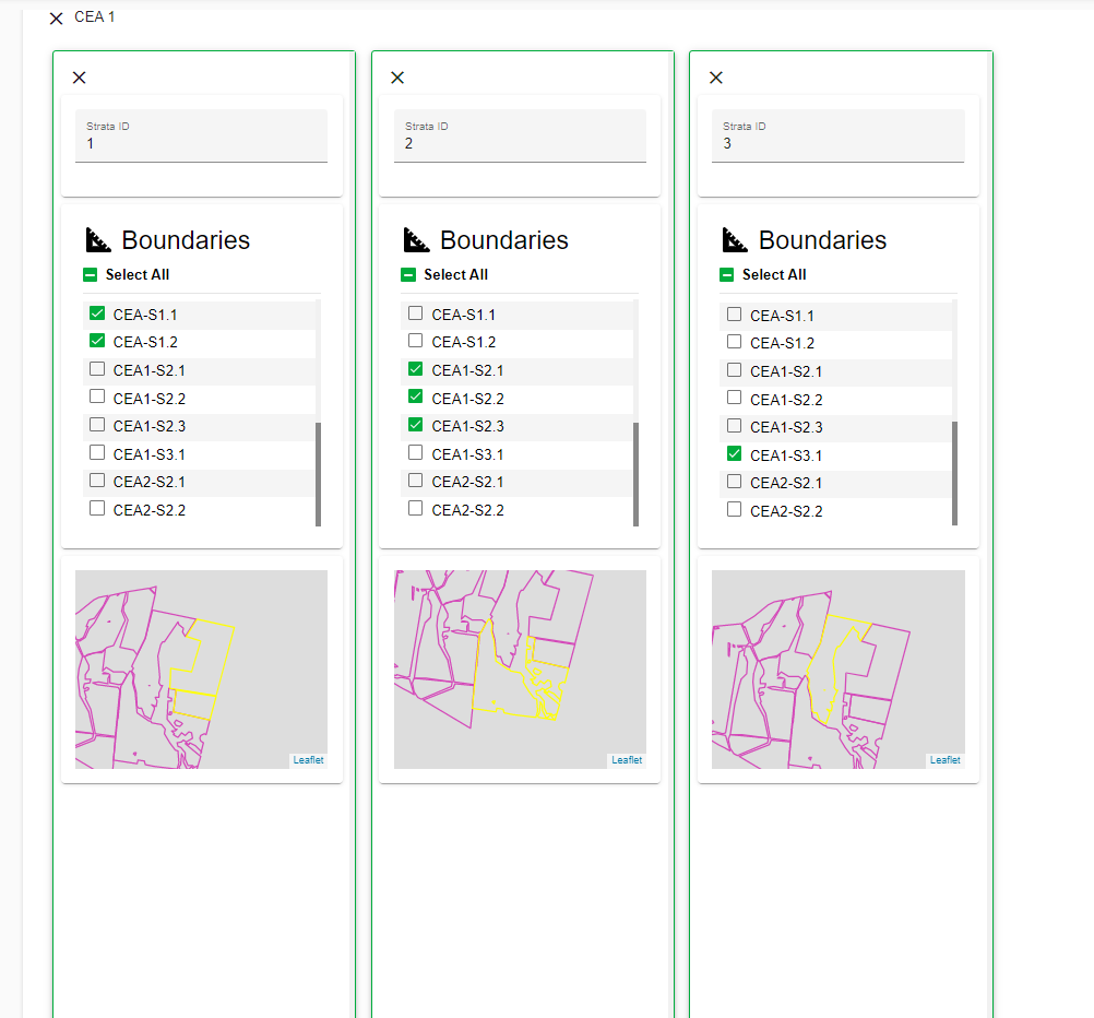 - A map will highlight the selected strata. For example, in the below example, 'Strata 1' consists of two separate boundaries; CEA-s1.1 and CEA-S1.2. These have both been selected and will be calculated together as 'CEA 1, Strata 1' in the calculations.