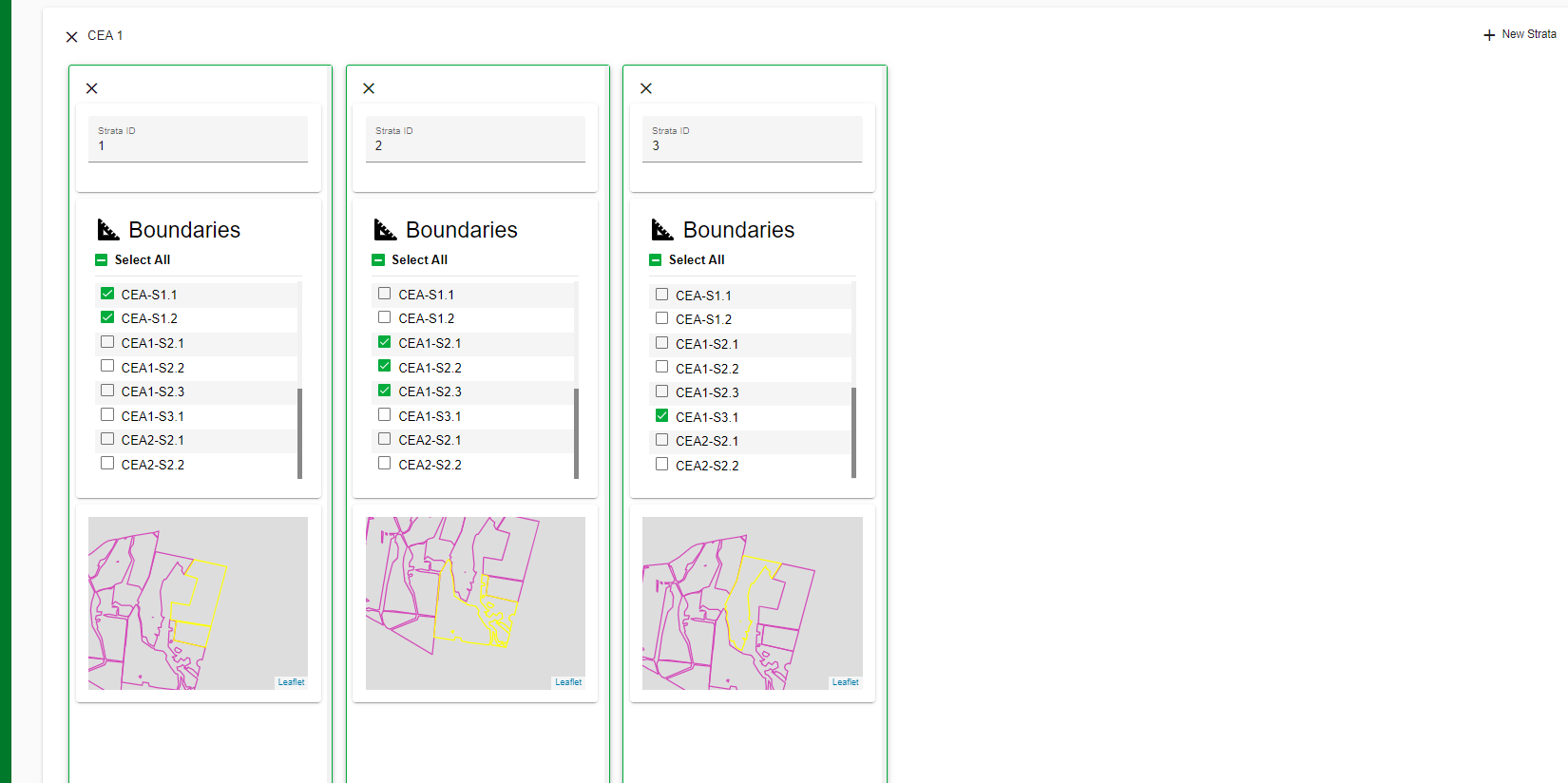 - Enter the name of each strata and select the corresponding boundaries in FarmLab. You can add additional strata by selecting the '+ New Strata' button at the top right-hand corner of the screen.