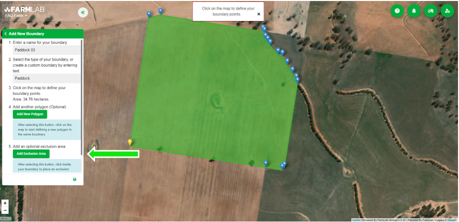 3. After selecting an Add Exclusion Area click in the middle of your polygon (paddock), this will automatically exclude a editable square