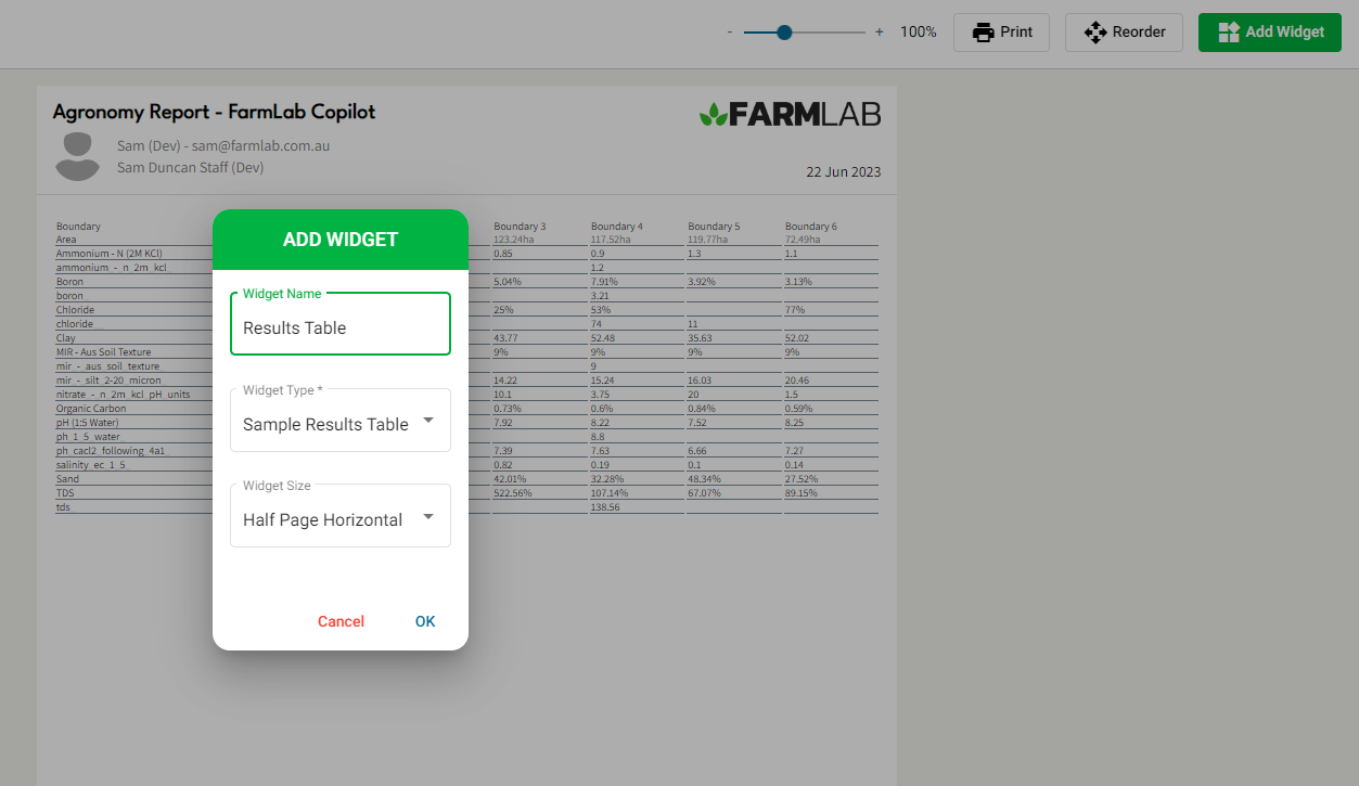 Open FarmLab Analytics and create a 'Sample Results' table widget. Format the table to display the specific results you want to analyze.