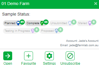 - Sample Status. This previews the farms point status, informing on Complete, Planned, Unsubmitted, Mailed, Testing in Progress, and Proposed point status.