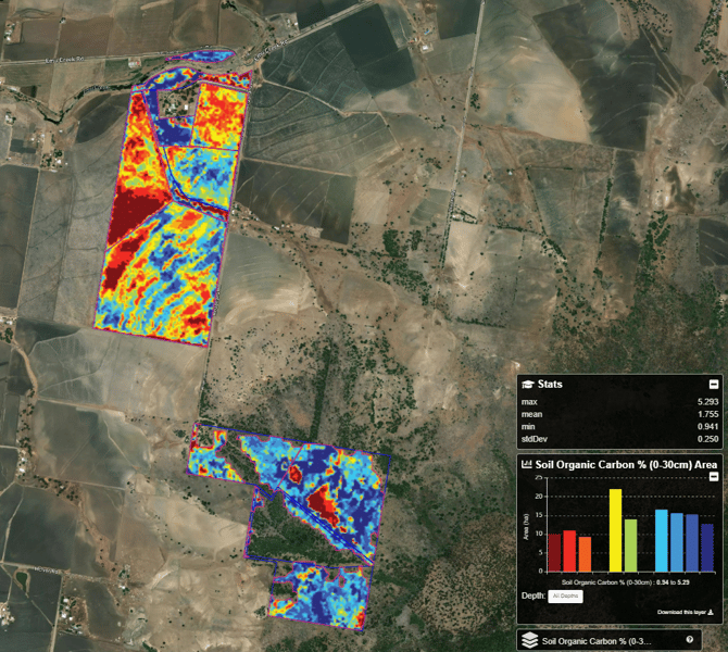The Soil Organic Carbon % (SOC %) layer was developed by GXLab using a combination of advanced machine learning techniques, historical soil data, and environmental factors as part of the National Soil Carbon Innovation Challenge. It is currently only available in Australia, however you can find out more about the background to the model and the challenge here: https://getfarmlab.com/advancing-soil-carbon-quantification-with-remote-sensing-and-machine-learning/